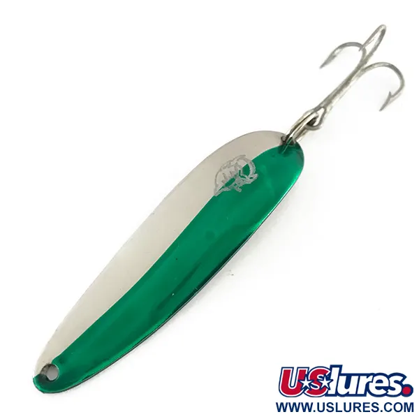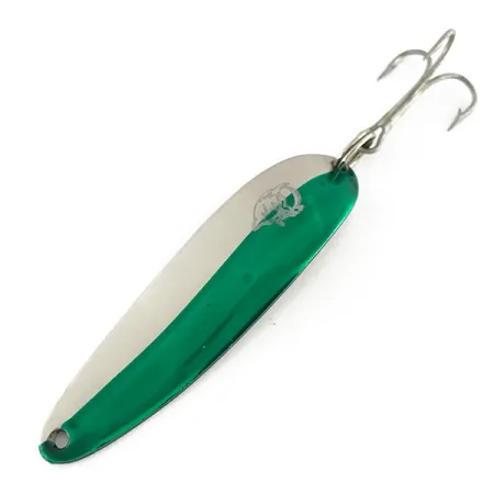 Een opvallende diagonale verdeling van gepolijst nikkel en doorschijnend groen bepaalt de visuele aantrekkingskracht van dit model. Met een gewicht van 14 g (1/2 oz) is deze Eppinger Dardevle Cop-E-Cat 7400 een klassieke vertegenwoordiger van het visserserfgoed uit Detroit. De achterkant van de lepel toont duidelijk de gestempelde kenmerken "COP-E-CAT 7400" en "DETROIT U.S.A.", wat de geschiedenis verankert in de oorspronkelijke wortels van het merk in Michigan. Met een lengte van 6,5 cm (2 1/2") is het iconische duivelskoplogo gegraveerd in de groengetinte zijde van het metaal. De zware dreg is stevig bevestigd via een splitring aan de achterzijde, waardoor hij geschikt is voor zowel werpen als trollen. Dit specifieke exemplaar, geïdentificeerd door productcode 8392, heeft een conditiescore van 5/5 en vertoont de heldere reflecties en schone oppervlakken die worden verwacht van een goed bewaard verzamelobject. De concave vorm van het blad is een kenmerk van de ontwerpfilosofie van Eppinger, die in 1906 begon in de kelder van Lou Eppinger.