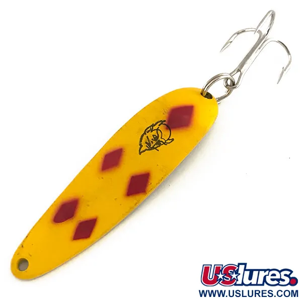 Duidelijk gestanst in de koperkleurige achterzijde, verankert 'COP-E-CAT 7400 DETROIT U.S.A.' deze lepel van 14 g in zijn Michigan-erfgoed. Deze specifieke Eppinger Dardevle Cop-E-Cat 7400, aangeduid met productcode 9166, toont de klassieke Five of Diamonds-afwerking: een heldergele voorzijde versierd met vijf opvallende rode ruiten. Op de voorkant staat ook het herkenbare zwarte duivelskoplogo, synoniem voor de oprichting van Lou Eppinger in Detroit in 1906. Met een lengte van 6,5 cm heeft de lepel een langwerpig, concaaf lichaam ontworpen voor werpend vissen en trollen. Dit exemplaar verkeert in uitstekende staat, beoordeeld met 5/5, met strakke verf op de voorzijde en een glanzende, goed bewaarde metalen achterzijde. De lepel is nog steeds voorzien van de originele splitring en dreg, wat de kwaliteit van het Amerikaanse visgerei uit het midden van de 20e eeuw weerspiegelt.