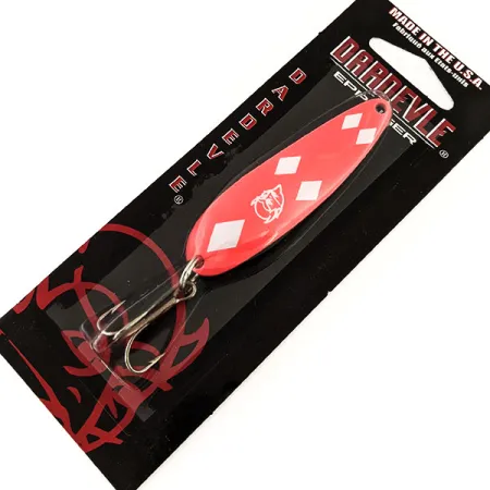 Met een lengte van 6,5 cm (2 1/2 inch) geeft deze Eppinger-klassieker een high-visibility draai aan een legendarisch silhouet. De Dardevle Cop-E-Cat 7400 UV (Productcode 13057) weegt 14 g (1/2 oz) en heeft een opvallende roze afwerking, geaccentueerd door vier duidelijke diamanten en het kenmerkende duivelskoplogo. Terwijl de voorkant knalt met kleur, behoudt de achterzijde een traditionele nikkelafwerking. Dit exemplaar is ongebruikt en nog bevestigd aan de originele zwart-rode kaart. Onder UV-licht krijgen de diamantpatronen en het logo een helderblauwe gloed, een functie die specifiek is ontworpen om de zichtbaarheid in dieper of troebel water te vergroten. Het concave profiel en de langwerpige vorm van de lepel worden geproduceerd met eigen matrijzen in de USA, een productietraditie die Eppinger al meer dan een eeuw handhaaft. Een stevige, zilverkleurige dreg is met een splitring aan de staart bevestigd, klaar voor het werpen of trollen.