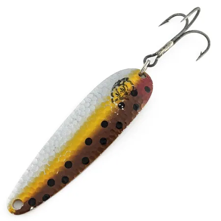 De gehamerde afwerking geeft de voorzijde van deze Eppinger lepel een realistische schittering, waarbij het licht wordt gevangen op het zilveren, gele en bruine forelpatroon. Met een aanzienlijk gewicht van 50 g (1 3/4 oz) biedt deze lepel de massa die nodig is voor het trollen op diep water of het maken van verre worpen. De achterkant van het kunstaas onthult zijn herkomst uit Michigan, gestempeld met 'COP-E-CAT 7700 DEARBORN MICH' en het herkenbare duivelslogo op een schoon messing oppervlak. Met een lengte van 11 cm (4 1/4") is de metalen body geaccentueerd met opvallende zwarte stippen die contrasteren met de warme gele en bruine kleurovergangen. Dit specifieke exemplaar, herkenbaar aan productcode 23290, verkeert in een conditie van 4/5, met slechts lichte gebruikssporen op het originele beslag. De grote dreg is stevig bevestigd via een extra sterke splitring, waardoor de structurele integriteit van het geheel behouden blijft.