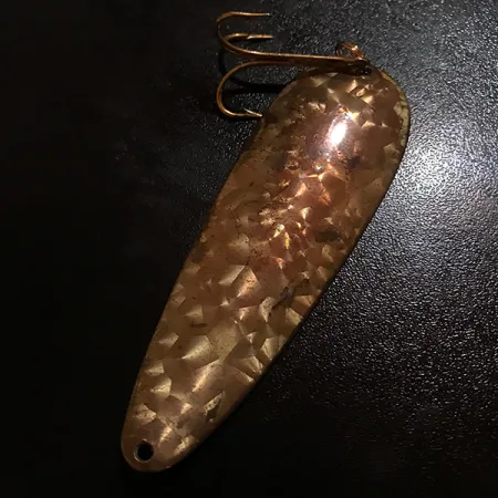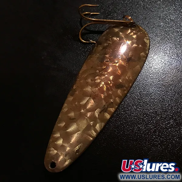 Met een lengte van 9 cm (3 1/2") toont het aanzienlijke oppervlak van deze lepel de getextureerde "Crystal"-afwerking die model 8743 kenmerkt. Met een gewicht van 28 g (1 oz) is de zware metalen uitvoering een bewijs van Eppinger's traditie van Amerikaanse duurzaamheid. De concave, langwerpige vorm, een ontwerpkenmerk sinds de begindagen van Lou Eppinger in Detroit, is hier gekoppeld aan een klassieke dreg. Dit exemplaar is in goed bewaarde staat en krijgt een conditiescore van 4/5 voor de schone, reflecterende oppervlakken en robuuste hardware. De gehamerde textuur zorgt voor een veelzijdige lichtreflectie, een techniek die de fabrikant uit Dearborn al meer dan een eeuw toepast. Het is vermeldenswaard dat de effectiviteit van deze lepels leidde tot hun opname in overlevingspakketten voor de luchtvaart van de Amerikaanse overheid in oorlogstijd. Voor werpen of trollen zorgt het aanzienlijke gewicht ervoor dat diepere waterlagen worden bereikt terwijl de actie behouden blijft. De bronskleurige dreg is stevig bevestigd via een robuuste splitring aan de achterzijde, terwijl de voorste verbinding open blijft voor een wartel.