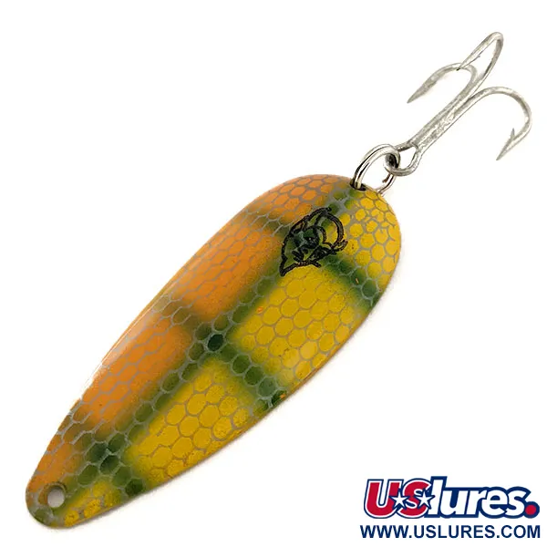 Deze vintage lepel, uitgevoerd in een geel en groen schubbenpatroon op een oranje basis, is een schoolvoorbeeld van het vakmanschap dat Detroit tot een centrum voor innovatie in de hengelsport maakte. De 7 cm (2 3/4") Eppinger Dardevle Dardevlet draagt het iconische zwarte duivelskop-logo op de voorkant, een kenmerk voor verzamelaars en sportvissers die op snoek of zalm vissen. Met een gewicht van 19 g (2/3 oz) heeft de lepel een hol metalen lichaam dat overgaat in een gepolijste nikkelafwerking op de achterkant. De achterzijde is gestempeld met DARDEVLET en DETROIT, U.S.A., wat de productierijke historie markeert van voordat het bedrijf in 1959 verhuisde. Dit exemplaar, met productcode 11798, verkeert in uitstekende staat met een waardering van 5/5, voorzien van levendige lak en een schoon metalen oppervlak. Hij is uitgerust met een stevige dreg die met een splitring is bevestigd, geschikt voor diverse werp- en sleeptaltechnieken.