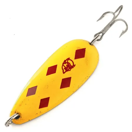 Met een gewicht van 21 g (3/4 oz) is deze Eppinger lepel voorzien van het iconische Five of Diamonds patroon, bestaande uit vijf dieprode ruiten op een levendige gele achtergrond. Dit exemplaar is de Dardevle Dardevlet, met een lengte van 7 cm (2 3/4"), en is een vast onderdeel van de collectie voor liefhebbers van hengelsportmateriaal uit Michigan. De voorzijde is versierd met het klassieke rode duivelskop-logo, terwijl de gestempelde messing achterkant de productie in Dearborn, Michigan bevestigt. Dit specifieke item, productcode 11970, verkeert in 5/5 conditie, met een zuivere afwerking en goed bewaarde lak die het erfgoed van Lou Eppinger's ontwerpen benadrukt. De specifieke langwerpige vorm en het holle oppervlak worden verkregen met de eigen matrijzen van de fabrikant, essentieel voor traditionele werptechnieken. De lepel is uitgerust met origineel beslag, waaronder een scherpe dreg en robuuste splitringen bevestigd door nauwkeurig geboorde oogjes.