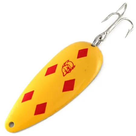 Deze vintage lepel weegt 21 g (3/4 oz) en is voorzien van het iconische Five of Diamonds-patroon, bestaande uit vijf scherpe rode ruiten tegen een heldergeel emaille. De achterkant van het 7 cm (2 3/4 inch) blad is gestempeld met de naam Dardevlet en de locatie Dearborn, MI, een kenmerk van de Eppinger-productie sinds de verhuizing van het bedrijf in 1959. Dit specifieke exemplaar, geïdentificeerd door productcode 12338, verkeert in 5/5 conditie met een opmerkelijk schone afwerking en geen zichtbare lakslijtage door de haken. Het klassieke duivelskoplogo is scherp gedrukt op de bolle zijde, gecentreerd tussen de diamantmotieven. Een stevige zilverkleurige dreg is bevestigd met een heavy-duty splitring, klaar voor werpen of trollen. De gepolijste koperkleurige onderkant is nog steeds glanzend en weerspiegelt de hoge productienormen van de in Michigan gevestigde firma.