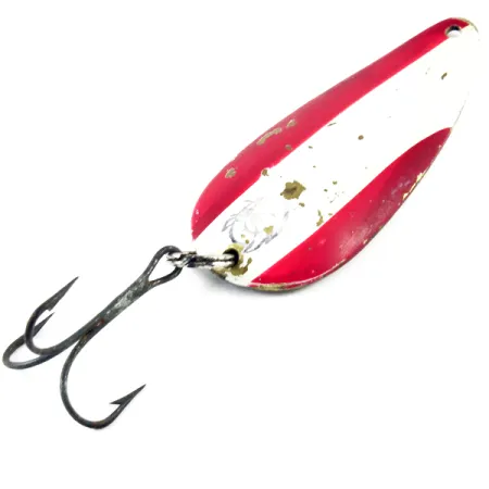 Met een gewicht van 21 g (3/4 oz) heeft deze vintage lepel de onmiskenbare massa van een echte werplegende. Met een lengte van 7 cm (2 3/4") vertoont de Eppinger Dardevle Dardevlet, productcode 3133, het klassieke rood-wit gestreepte patroon op de bovenzijde. Kleine beschadigingen in het email laten de messing basis zien, wat karakter geeft aan een kunstaas dat duidelijk deel heeft uitgemaakt van de uitrusting van een visser. De achterzijde is voorzien van de stempels "DARDEVLET" en "DETROIT U.S.A." die direct in het messing zijn gedrukt, een detail dat de herkomst plaatst vóór de verhuizing van het bedrijf naar Dearborn in 1959. Dit exemplaar, gewaardeerd met een 4/5, heeft nog de originele dreg en blijft een solide voorbeeld van de unieke gestanste vormen die Lou Eppinger in Michigan populair maakte. Het holle oppervlak en de zware bouw maken hem evenzeer geschikt voor verre worpen als voor diep trollen.