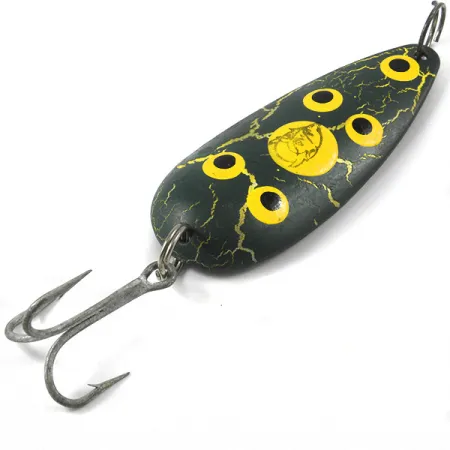 Een gewicht van 21 g geeft deze lepel voldoende massa om bij een verre worp door de tegenwind heen te slaan. Afgewerkt in de klassieke Frog-kleurstelling, heeft het blad een donkere basis met een geel crackle-effect en vijf duidelijke gele stippen met zwarte kernen. Het iconische duivelskoplogo staat prominent in het geel nabij het midden van het 7 cm lange lichaam. De achterkant van het kunstaas is van gepolijst nikkel, diep gestempeld met het merkteken "DARDEVLET EPINGER DETROIT USA", een kenmerk van de wortels van de Eppinger company in Michigan sinds 1906. Dit specifieke exemplaar, productcode 3284, verkeert in sublieme staat (5/5), waarbij de verf en het metaalwerk er als nieuw uitzien. Het kunstaas is voorzien van een robuuste dreg, bevestigd via een splitring, klaar voor zwaar trollen of werpen. Het contrast tussen de donkere, getextureerde bovenkant en de heldere nikkelen achterkant zorgt voor een sterke visuele schittering in het water.