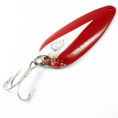De koperen plating op de achterzijde van deze Eppinger Dardevle Dardevlet is voorzien van de iconische Detroit-stempel, wat duidt op de erfgoedwaarde uit de historische productieperiode van het merk. Dit exemplaar van 21g (3/4oz) met productcode 3434 is 7cm (2 3/4") lang en draagt het kenmerkende duivelskop-logo op de voorkant. Het klassieke rood-witte patroon is aangebracht met een opvallende witte flits in het midden, een ontwerp dat Lou Eppinger ontwikkelde om een gewonde aasvis na te bootsen met behulp van eigen productiemallen. Dit exemplaar scoort een 4/5 qua conditie en vertoont eerlijk karakter met lakverlies en slijtage nabij de onderste splitring en haakbevestiging, terwijl de gestempelde koperen achterkant glanzend en helder blijft. De lepel is uitgerust met de originele dreg, geschikt voor het zware werpen waarvoor dit model bedoeld is. Bij het vissen met deze lepels is de koperen achterzijde bijzonder nuttig voor het creëren van een warme schittering in troebel of gekleurd water, een truc die ervaren sportvissers al decennia gebruiken om aanbeten uit te lokken wanneer nikkelen afwerkingen falen. Het langwerpige, concave lichaam is ontworpen voor een specifieke waggelende actie bij het binnenvissen, trouw aan de in Detroit geboren ontwerpen die sinds 1906 de tackleboxen vullen.