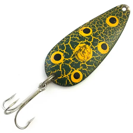 Groene en gele crackle-texturen definiëren de klassieke "Frog"-afwerking op deze 21g (3/4oz) werplepel. Dit specifieke Eppinger-exemplaar, bekend als de Dardevlet, draagt productcode 5408 en heeft een totale lengte van 7 cm (2 3/4"). Op de gepolijste nikkelen achterzijde is duidelijk de stempel "DARDEVLET - DETROIT - U.S.A." te zien, een directe link naar de beginjaren van het bedrijf in Detroit voordat ze in 1959 naar Dearborn verhuisden. De voorkant is gedecoreerd met gele stippen met zwarte kernen, rondom een centrale gele cirkel met het iconische duivelskop-logo. Wat conditie betreft scoort hij een solide 5/5; de lak is uitzonderlijk schoon en de vernikkeling op de holle zijde is zeer reflecterend. Hij is uitgerust met een sterke dreg en een zware kwaliteit splitring aan de kop. Dit Dardevlet-model is ontworpen als een middelgrote optie in de serie, gebruikmakend van de gepatenteerde holle vorm die Lou Eppinger ontwikkelde om de actie in het water tijdens het werpen of trollen te beïnvloeden.