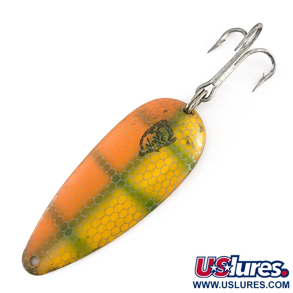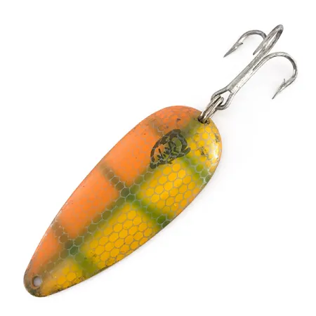 Het gepolijste nikkelwerk vangt het licht op de achterzijde van deze 21g (3/4oz) lepel, voorzien van de kenmerkende "DARDEVLET" en "DEARBORN MI" stempels die verzamelaars zoeken. Met een lengte van 7 cm (2 3/4") toont de voorzijde van dit kunstaas een opvallende combinatie van oranje en groene tinten in een kruispatroon. Een fijne honingraat-schubbenlaag voegt een glinsterende textuur toe aan het geverfde oppervlak, waar het beroemde zwarte duivelskoplogo scherp zichtbaar blijft. Deze lepel, bekend onder productcode 8412, is vervaardigd met Eppinger's eigen matrijzen, wat zorgt voor de specifieke concave diepte die nodig is voor zijn kenmerkende waggelende actie. Het beslag is in uitstekende staat, met een stevige splitring en een glimmende dreg. Afkomstig uit de Dearborn-fabriek, sinds 1959 de thuisbasis van het merk, is dit een prachtig voorbeeld van Amerikaanse hengelsportgeschiedenis. De conditie is beoordeeld als 5/5, een bewijs van de klassieke kwaliteit uit Michigan.