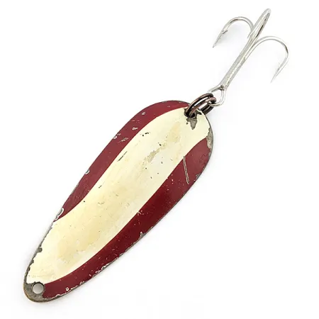 Deze vintage lepel valt op door de gedurfde Red Devle-afwerking, met de iconische witte middenstreep tussen twee karmozijnrode vlakken. Dit exemplaar van 21 gram (3/4oz) vertoont authentieke gebruikssporen met duidelijk lakverlies en beschadigingen langs de randen, wat past bij zijn verleden in de tacklebox en een conditiescore van 3/5. Met een lengte van 7 cm (2 3/4") is de zware metalen body aan de achterzijde voorzien van het klassieke stempel '“DARDEVLET” DETROIT U.S.A.', een kenmerk van de Eppinger-productie uit de jaren 20 tot 40. Deze kunstaaslepel, gecatalogiseerd onder productcode 22794, is uitgerust met een stevige splitring en een enkele grote dreg aan de staart. De metalen achterkant reflecteert nog steeds mooi en contrasteert met het versleten emaille aan de voorzijde. Dit in Amerika gemaakte kunstaas is ontworpen voor het werpen in dieper water, waar hij door zijn specifieke gewicht dieptes bereikt die voor lichtere lepels onbereikbaar blijven.