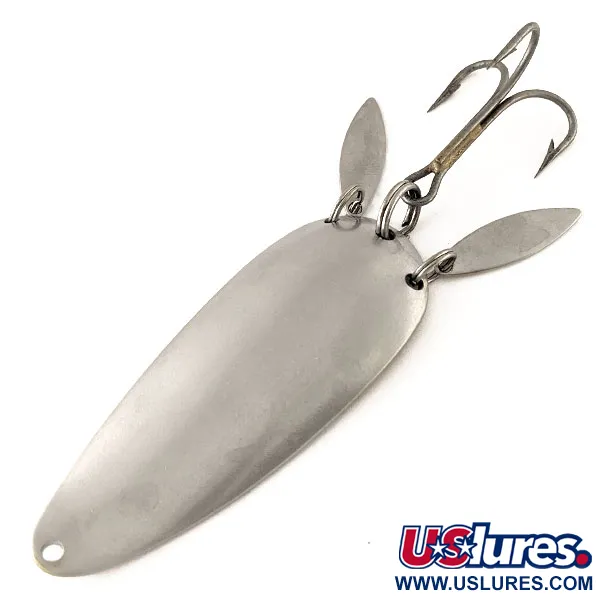 Met een gewicht von 21 g blijft deze zware metalen lepel een opvallend item voor elke verzamelaar die gespecialiseerd is in hengelsportmateriaal uit Michigan. Het kenmerk van dit Dardevlet Klicker-model zijn de twee kleine, traanvormige metalen blaadjes die aan de achterste splitring zijn bevestigd naast de dreg. Deze blaadjes raken het lichaam van de lepel tijdens het binnendraaien, wat een mechanisch klikgeluid produceert dat de visuele schittering van de zilveren afwerking aanvult. De achterkant is voorzien van de scherpe, diep ingestempelde tekst die het identificeert als een echte 'DARDEVLET' uit 'DETROIT U.S.A.', een teken van herkomst voordat Eppinger de activiteiten in 1959 naar Dearborn verplaatste. Met een lengte van 7 cm en productcode 12300 is dit exemplaar opmerkelijk goed bewaard gebleven. Het gepolijste zilveren oppervlak is vrij van noemenswaardige onvolkomenheden of oxidatie, wat de conditie 5/5 weerspiegelt. Een stevige dreg is bevestigd via een robuuste splitring, klaar voor werpend vissen of trollen waarbij een combinatie van flits en geluid vereist is.