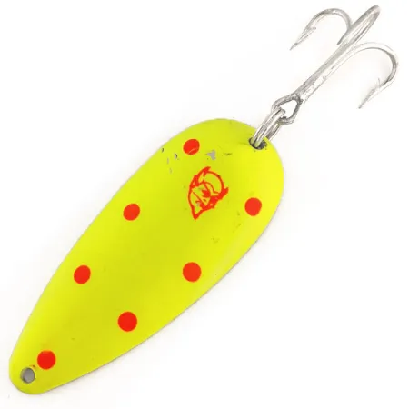 Met een lengte van 7 cm (2 3/4 inch) is deze lepel afgewerkt in een goed zichtbare Chartreuse met roze stippen over een gepolijste nikkelen basis. Dit Dardevlet-model, met productcode 12410, weegt 21 g (3/4 oz) en is voorzien van het iconische rode duivelskopstempel, een eerbetoon aan de begindagen van het merk in Detroit onder Lou Eppinger in 1906. Ontworpen als een fluorescerende UV Glow-variant, zorgt de gespecialiseerde verf voor een levendige groene luminescentie in omstandigheden met weinig licht, waardoor het een technische keuze is voor diepwatertoepassingen. Het kunstaas is uitgerust met een scherpe dreg en een robuuste splitring, die beide minimale slijtage vertonen. In de huidige 5/5 conditie is de verf uitzonderlijk schoon en de vernikkeling op de achterkant blijft helder. Eppinger gebruikt specifieke eigen matrijzen om de kenmerkende langwerpige vorm van het metaal te creëren, wat aanzienlijke werpafstanden mogelijk maakt, zelfs in winderige omstandigheden.