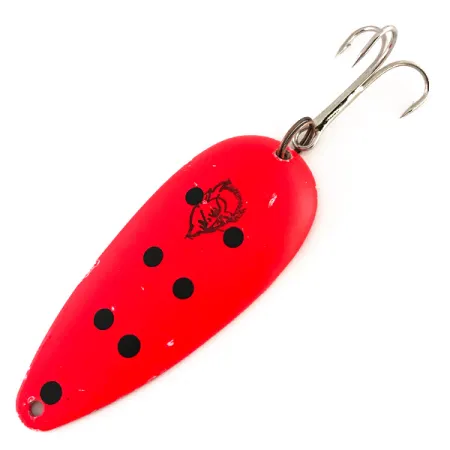 Levendige rode lak geaccentueerd door vijf dikke zwarte stippen definieert het visuele karakter van deze klassieke werplepel van 21 g (3/4 oz). Dit Dardevle Dardevlet UV-model, herkenbaar aan productcode 8248, is speciaal ontworpen met een fluorescerende afwerking die intens oplicht bij blootstelling aan UV-licht, een moderne evolutie van de in Detroit geboren Eppinger-erfenis. Met een lengte van 7 cm (2 3/4") is het kunstaas voorzien van het kenmerkende gestempelde duivelslogo op de bolle zijde. De achterzijde is afgewerkt met gepolijst nikkel, wat zorgt voor een scherpe schittering die de felrode bovenkant aanvult. De fabricage is gebaseerd op de eigen matrijzen van de fabrikant, wat resulteert in een specifiek concaaf profiel dat sinds het begin van de 20e eeuw een vast onderdeel is van tackleboxen. De hardware bestaat uit een robuuste splitring en een scherpe dreg. Met een beoordeling van 5/5 is de conditie van dit exemplaar uitzonderlijk, waarbij de lak en de metalen afwerking geen tekenen van ouderdom of gebruik vertonen. Deze specifieke kleurstelling is zeer functioneel in troebel water waar de UV-eigenschappen en het nikkelcontrast zorgen voor een hoge zichtbaarheid.