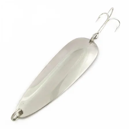 Het duidelijk op de concave binnenzijde gestempelde opschrift "Dardevle Detroit USA" identificeert deze casting lepel uit het midden van de vorige eeuw. De glanzende nikkelen afwerking op het 3 1/2" (9 cm) lichaam zorgt voor een scherpe flits, waardoor hij goed zichtbaar is tijdens het binnenvissen. Met een gewicht van 1 oz (28 g) vergemakkelijkt het dichte metalen lichaam verre worpen, zelfs bij winderige omstandigheden. Dit exemplaar uit de jaren 50, gecatalogiseerd onder code 24592, heeft een schoon en reflecterend oppervlak met een conditiescore van 4/5. De druppelvorm en gewichtsverdeling zijn ideaal voor diepwatervissen en gestaag trollen.