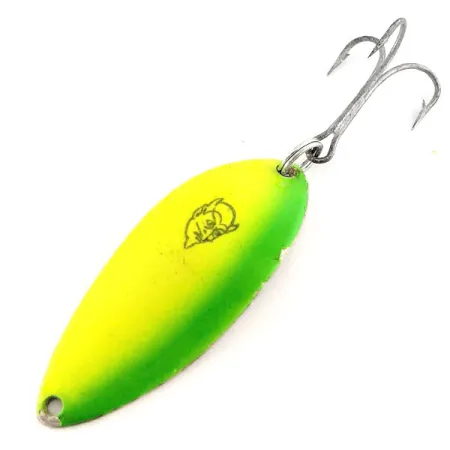 Met een overgang van levendig geel aan de bovenkant naar weelderig groen bij de staart, is de afwerking van deze lepel ontworpen om de aandacht te trekken. Met een gewicht van 14g (1/2oz) en een lengte van 5,5cm (2 1/4"), is deze Eppinger Dardevle Devle Dog 5400 UV voorzien van de legendarische gestempelde duivelskop op de bolle zijde. Bij weinig licht gloeit de UV-reactieve lak met een intense groene lichtkracht, een moderne technische draai aan een ontwerp dat gebruikmaakt van eigen matrijzen die synoniem staan voor Amerikaans vakmanschap. Geregistreerd onder productcode 12409, is het kunstaas uitgerust met een robuuste dreg bevestigd via een splitring. De nikkelen afwerking op de achterzijde zorgt voor een klassieke schittering als contrast met de felle UV-kleuren. Dit exemplaar verkeert in uitstekende 5/5 conditie, waarbij de fabriekslak en het beslag volledig intact zijn. Eppinger produceert deze lepels in Michigan sinds de verhuizing uit Detroit in 1959, waarbij specifieke metaaldiktes worden gebruikt om de gewenste zinksnelheid te bereiken.