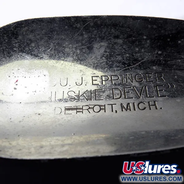 Met een gewicht van maar liefst 3 1/4 oz (91 g) is deze heavy-duty lepel ontworpen voor het werpen in diep water of slepend vissen op kapitale roofvissen. Dit exemplaar van Eppinger, bekend als de Huskie Devle (productcode 0245), heeft een aanzienlijke lengte van 5 1/2" (14 cm). De klassieke Rood / Wit afwerking aan de voorzijde is verfraaid met een kenmerkende honingraattextuur over de witte delen. De achterzijde onthult de gestempelde chromen rug, duidelijk gemarkeerd met de naam "EPPINGER HUSKIE DEVLE" en de herkomst "DEARBORN, MICH.", wat dit model dateert van na de verhuizing van het bedrijf in 1959. Een uniek kenmerk van dit specifieke model is het kleine geel geschilderde flutterblad aan de achterste splitring, versierd met rode ruiten en het iconische duivelskoplogo. De hardware is robuust, voorzien van een grote, zilverkleurige dreg die klaar is voor zwaar werk. In een conditie van 4/5 blijft de verf levendig en het metaal behoudt een hoogwaardige glans, wat het duurzame Amerikaanse vakmanschap van die tijd toont. De gestempelde details op de achterkant blijven scherp en leesbaar tegen het gepolijste oppervlak.
