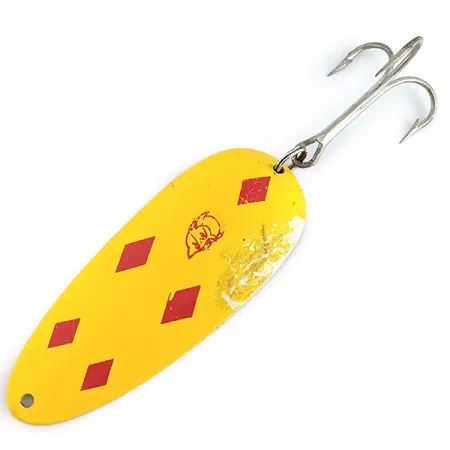 Met een gewicht van maar liefst 58 gram (2 oz) is dit zware stukje hengelsportgeschiedenis uit Michigan speciaal ontworpen voor het vissen op grote roofvissen. Deze Eppinger Dardevle Huskie Junior 700-serie, geregistreerd onder productcode 22182, is uitgevoerd in de legendarische "Five of Diamonds" afwerking — vijf strakke rode ruiten op een felgele basis. De voorzijde toont het herkenbare rode duivelslogo, terwijl de achterzijde duidelijk in het messing is gestempeld met "700 SERIES", "LOU J. EPPINGER", "HUSKIE JR." en "DEARBORN MICH."