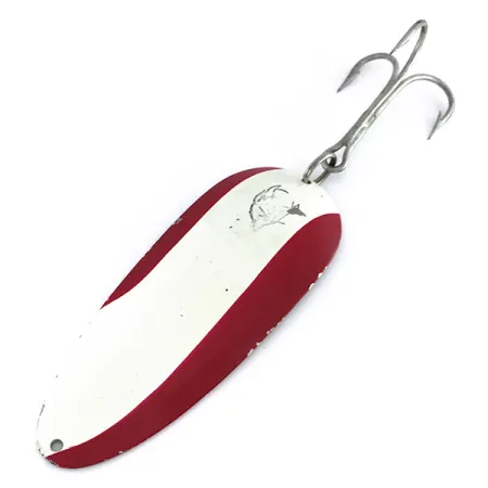 Kenmerkende rode en witte strepen sieren de voorzijde van deze 58g (2 oz) lepel, een handelsmerk van de Eppinger-traditie. Met een lengte van 11,5 cm (4 1/2") is deze Dardevle Huskie Junior, voorzien van productcode 8037, gebouwd voor de zware eisen van de visserij op grote roofvissen. Op de achterzijde is de nikkelen afwerking duidelijk gestempeld met de merknamen 'HUSKIE JUNIOR' en 'EPPINGER', een bewijs van de eigen gietvormen die sinds de begindagen van het merk in Detroit in hun fabriek in Michigan worden gebruikt. Dit exemplaar verkeert in 4/5 conditie, waarbij de levendige kleuren en structurele integriteit behouden zijn gebleven met slechts lichte oppervlakkige slijtage door gebruik door de jaren heen. De brede, langwerpige vorm en diepe concave buik zijn specifiek ontworpen voor stabiliteit tijdens het langzaam binnenvissen of trollen, een favoriete techniek voor snoek en muskellunge. Een grote dreg in originele stijl is stevig bevestigd met een heavy-duty splitring, klaar voor gebruik of display.