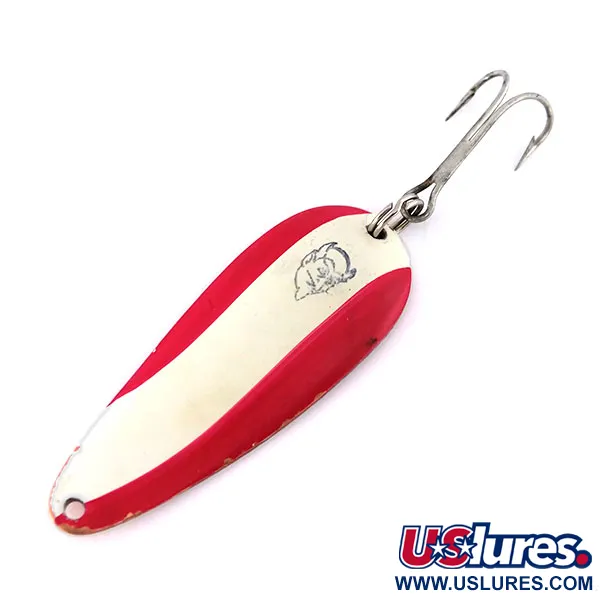 Met een gewicht van 11 g (2/5 oz) is deze Eppinger Dardevle Imp, productcode 10012, een klassiek voorbeeld van de Amerikaanse hengelsportgeschiedenis. Met een lengte van precies 5,5 cm (2 1/4") is de lepel voorzien van het iconische rood-wit gestreepte patroon op de voorzijde, geaccentueerd door het bekende duivelskoplogo in het midden. De achterzijde onthult een blank koperen rug, duidelijk gestempeld met "DARDEVLE IMP U.S.A." om de herkomst en het model aan te duiden. Dit specifieke exemplaar verkeert in 5/5 conditie, met een uitstekend behoud van lak en metaal. De montage bestaat uit een stevige splitring met een scherpe dreg, klaar voor gebruik. Historisch gezien waren deze versies met koperen achterkant vaak favoriet in troebeler water, waar de warme metalen schittering door de mist kon snijden. De concave, langwerpige vorm is kenmerkend voor het ontwerp van Lou Eppinger uit 1906 uit Detroit, hoewel de latere productie naar Dearborn verhuisde. Dit formaat maakt hem zeer veelzijdig voor lichte tot middelzware werpcombinaties voor snoek of baars. De lak glanst hoog en de gestempelde markeringen op de achterzijde blijven scherp en leesbaar op het koperen oppervlak.
