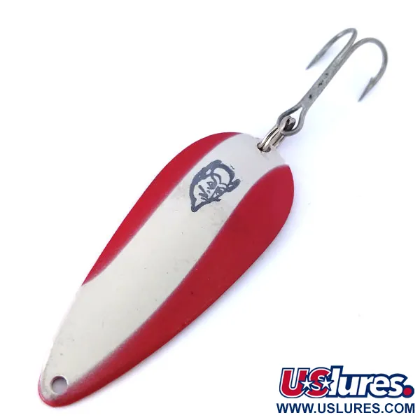 Met een gewicht van 11 g (2/5 oz) is de Dardevle Imp een van de meest herkenbare ontwerpen in de hengelsportgeschiedenis. De voorzijde is afgewerkt met het traditionele rood-wit gestreepte emaille, met het kenmerkende zwarte duivelskoplogo in het midden van de witte streep. Met een lengte van 5,5 cm (2 1/4") is de metalen body op de vernikkelde achterzijde gestempeld met "DARDEVLE IMP EPPINGER DETROIT MI", wat de vroege productiegeschiedenis van het bedrijf in Michigan weerspiegelt. Productcode 10452 is van toepassing op deze specifieke configuratie, die in een onberispelijke 5/5 staat verkeert. Aan de achterzijde is met een klassieke splitring een sterke dreg bevestigd, klaar voor werpen of trollen. De diep gebogen, langwerpige vorm van de lepel is ontworpen om een uitgesproken waggelende actie te geven tijdens het binnenvissen.