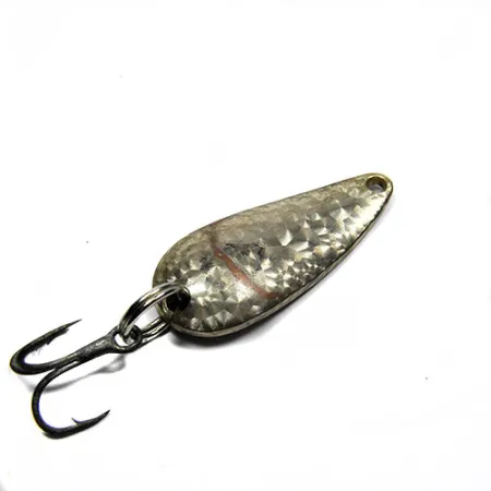 Gehamerde texturen vangen het licht op de Crystal silver scale afwerking van deze 3 cm (1 1/4") lepel. Deze Eppinger Lildevle, aangeduid met productcode 0341, is voorzien van het klassieke Detroit U.S.A. stempel op de achterzijde, een detail dat de herkomst uit de door Lou Eppinger opgerichte werkplaats in Michigan markeert. Met een gewicht van 3,4 g (1/8 oz) bestaat de hardware uit een robuuste dreg verbonden via een stevige splitring. Het kunstaas is in 4/5 conditie, met goed bewaard gebleven plating en schone stempels. De concave vorm van het blad is ontworpen voor een kenmerkende wiebelende actie tijdens een gelijkmatige inhaalbeweging, waardoor het een standaard is voor het werpen in zowel helder als troebel water. Het getextureerde oppervlak is bedoeld om de schittering van kleine aasvis te imiteren, een ontwerpprincipe dat Eppinger al sinds het begin van de 20e eeuw toepast.