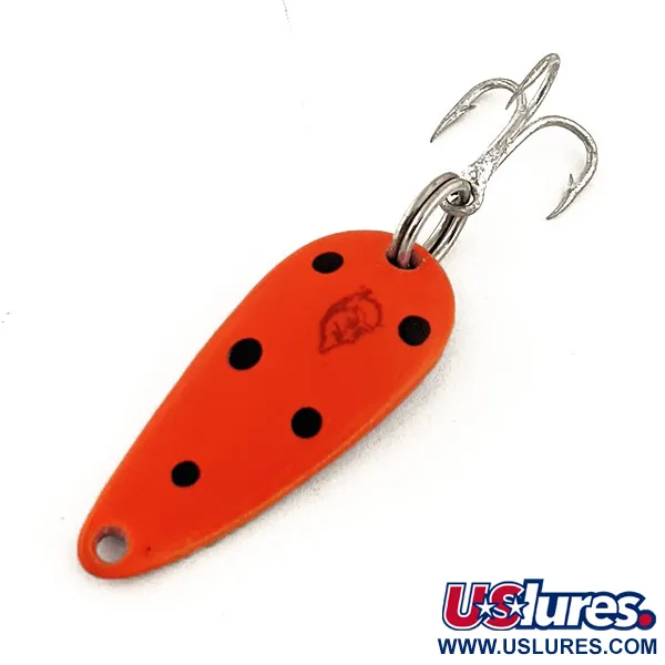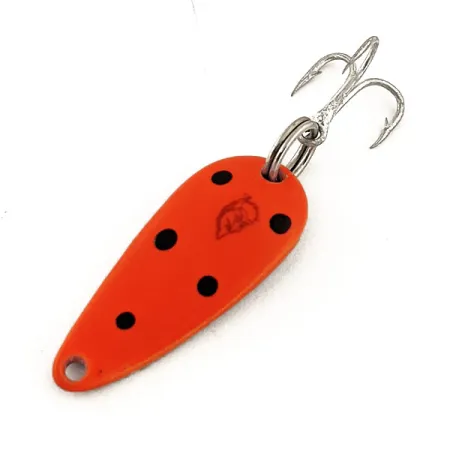 Opvallende zwarte stippen contrasteren scherp met het fluorescerende oranjerode oppervlak van deze 3 cm lange lepel. Gestempeld met het iconische duivelskoplogo, draagt deze Eppinger Dardevle Lildevle UV de productcode 12820. De nikkelen achterzijde zorgt voor een secundaire schittering, terwijl de gespecialiseerde verf een aanzienlijke gloed geeft onder UV-licht – een moderne draai aan een erfenis uit Michigan die teruggaat tot de originele ontwerpen van Lou Eppinger uit 1906. Met 3,4 g (1/8 oz) biedt hij genoeg gewicht voor nauwkeurige worpen naar structuren of scholen vis. De hardware omvat een stevige splitring en een scherpe zilveren dreg, beide in uitstekende staat met een 5/5 beoordeling. De eigen matrijzen van Eppinger geven deze lepel zijn kenmerkende concave profiel, dat zorgvuldig is behouden sinds het bedrijf in 1959 naar Dearborn verhuisde. Het compacte formaat en de opvallende afwerking maken het een betrouwbare keuze voor het vissen op forel of baarsachtigen in diverse wateromstandigheden.