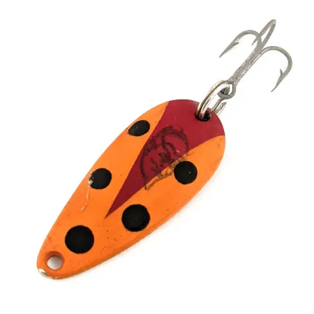 Met een gewicht van 6 g (3/16 oz) is deze lepel een veelzijdige keuze voor licht werpend vissen of trollen. De voorzijde is afgewerkt met een helder oranje emaille, geaccentueerd door vijf zwarte stippen en een kenmerkende donkerrode diagonale baan. Centraal op het rode gedeelte staat het klassieke Eppinger duivelskop-logo, een symbool van het erfgoed van het in Michigan gevestigde bedrijf sinds 1906. De lepel is 3,5 cm (1 1/2 inch) lang en heeft een achterkant van gepolijst nikkel die duidelijk is gestempeld met "DARDEVLE MIDGET U.S.A.". Dit item, met productcode 12829, verkeert in uitstekende staat, beoordeeld met een 5/5 voor de goed bewaard gebleven lak en het originele beslag. De montage bestaat uit een standaard splitring aan de achterzijde in combinatie met een scherpe dreg, conform de fabrieksinstelling. Elke curve van het metaal is gevormd door eigen mallen die de Eppinger-lijn al generaties lang bepalen.