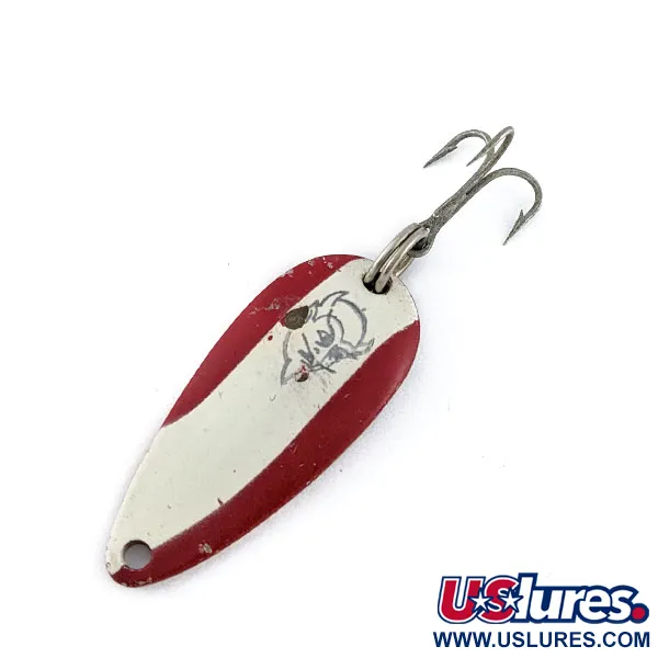 De inscriptie op de verzilverde achterzijde identificeert deze 3,5 cm (1 1/2") lepel duidelijk als een Dardevle Midget, vervaardigd in de VS. Dit exemplaar, gecatalogiseerd onder productcode 19130, is voorzien van het klassieke Red Devle-patroon — een rode laklaag onderbroken door een witte diagonale streep. Centraal op die witte streep staat het logo met het zwarte duivelskopje, een keurmerk dat al staat voor kwaliteit sinds Lou Eppinger begon met het maken van kunstaas in Michigan. Met een gewicht van 6g (3/16oz) is de holle, langwerpige vorm van de lepel ontworpen om een waggelende actie te produceren tijdens het binnenvissen. De verzilverde achterzijde is nog steeds helder, terwijl de geverfde voorzijde lichte gebruikssporen vertoont met wat kleine lakschade langs de randen, wat resulteert in een staat van 4/5. De montage bestaat uit een dreg die met een splitring is bevestigd, wat getuigt van dezelfde authentieke geschiedenis als de body van de lepel.
