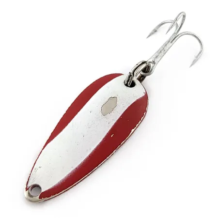 Een levendige Red Devle afwerking kenmerkt deze 3,5 cm (1 1/2") lepel, voorzien van de klassieke diagonale witte streep die het handelsmerk van Eppinger is geworden. Met een gewicht van 6 g (3/16 oz) vertoont dit specifieke exemplaar lichte gebruikssporen met een klein plekje lakschade op de voorzijde, wat een solide 4/5 conditie oplevert voor deze veteraan uit de tacklebox. De achterkant van het kunstaas is gepolijst en duidelijk gestempeld met "DARDEVLE MIDGET U.S.A.", wat het identificeert als een product van de productiemallen uit Michigan die in gebruik zijn sinds Lou Eppinger het bedrijf in 1959 van Detroit naar Dearborn verplaatste. Dit model 20790 is uitgerust met een originele dreg en splitring, klaar voor het werpen of licht trollen in helder water waar de nikkelkleurige achterkant voor een natuurlijke schittering zorgt. De druppelvorm van het metaal is zorgvuldig gevormd om de beweging van een aasvis na te bootsen zonder dat er complexe binnenvistechnieken nodig zijn.