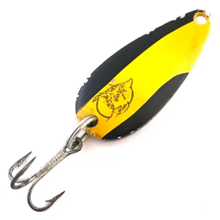 Het merk 'DARDEVLE MIDGET U.S.A.' is in de vernikkelde achterkant gestanst en identificeert dit item als een icoon uit de Amerikaanse hengelsportgeschiedenis. De voorkant heeft een opvallend diagonaal patroon van zwart en geel, met het iconische duivelskop-logo duidelijk gestanst op de gele streep. Met een lengte van 3,5 cm (1 1/2") en een gewicht van 6 g (3/16 oz) is dit een klassiek formaat voor licht materiaal, geschikt voor verschillende werptechnieken. De eigen matrijzen van Eppinger geven de lepel zijn kenmerkende concave vorm, wat de unieke waggelende actie creëert die het merk definieert sinds de begintijd van Lou Eppinger in Detroit. De lak vertoont wat lichte slijtage en chippen langs de randen, passend bij de 4/5 conditiebeoordeling, terwijl de dreg intact blijft en bevestigd is met een stevige metalen splitring. Verzamelaars van specifieke variaties zullen dit herkennen als productcode 5429.