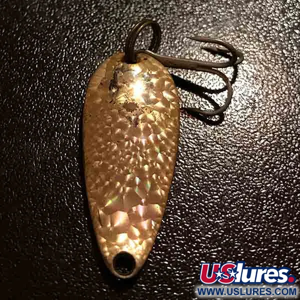 Een gehamerde 'Crystal' afwerking definieert het visuele karakter van deze Eppinger Dardevle Midget, waarbij licht vanuit meerdere hoeken wordt gereflecteerd over het getextureerde oppervlak. Met een gewicht van 3/16 oz (6 g) en een lengte van 1 1/2" (3,5 cm) is deze lepel een klassieke keuze voor forel of baarsachtigen op lichter materiaal. Op de achterkant van de lepel staat duidelijk het gestempelde identificatiekenmerk "DARDEVLE MIDGET", een kenmerk van het merk Eppinger dat vanuit Michigan opereert sinds Lou Eppinger het bedrijf in 1906 startte. Dit specifieke kunstaas, geïdentificeerd met productcode 11800, verkeert in een staat van 4/5. Het messingkleurige metalen lichaam vertoont de karakteristieke concave vorm die zorgt voor de kenmerkende actie in de waterkolom. De enkele dreg is bevestigd met een stevige splitring aan de bovenkant. Hoewel Eppinger de productie in 1959 verplaatste van Detroit naar Dearborn, maakt het productieproces nog steeds gebruik van eigen matrijzen om de specifieke geometrie van deze in de VS gemaakte lepels te behouden. Het 'Crystal'-patroon aan de bolle zijde is bedoeld om reflecties te breken en biedt een ander flitsprofiel vergeleken met de standaard gladde Dardevle-varianten die in veel vintage tackleboxen te vinden zijn.