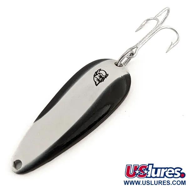 De koperen achterzijde van deze lepel is duidelijk gestempeld met het merk "ROK'T-DEVLE IMP. DEARBORN MICH.", wat de productiehistorie identificeert na de verhuizing van Eppinger in 1959. Met een afmeting van 5,5 cm (2 1/4") en een gewicht van 21 g (3/4 oz), heeft dit kunstaas een contrastrijke split-finish op de voorzijde; de ene helft is egaal zwart, terwijl de andere helft van gepolijst zilverkleurig metaal is, voorzien van het iconische zwarte duivelskoplogo. Dit specifieke kleurenpatroon, gekoppeld aan productcode 13136, is ontworpen voor het werpen en maakt gebruik van een klassieke concave druppelvorm voor een unieke actie in het water. Dit exemplaar is ongebruikt en verkeert in uitstekende staat, met een waardering van 5/5. De lak is scherp en de koperen achterkant vertoont de schone, originele metaalglans zonder tekenen van gebruik. Hij is uitgerust met een enkele grote dreg, verbonden door een stevige splitring. Sinds Lou Eppinger deze lepels in 1906 met de hand begon te maken in Detroit, hebben de gepatenteerde mallen voor de Dardevle-lijn een specifieke geometrie behouden die verzamelaars direct herkennen. Dit exemplaar is een goed bewaard gebleven stukje Amerikaanse hengelsportgeschiedenis uit de fabriek in Dearborn, Michigan.