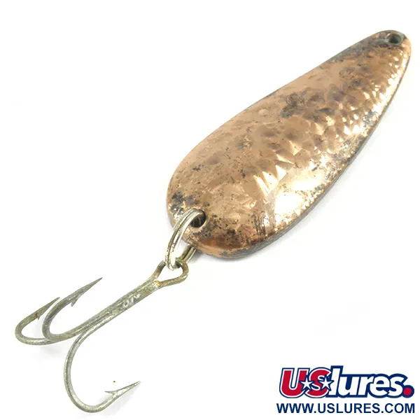 Een aanzienlijk gewicht van 21 g (3/4 oz) maakt deze compacte lepel een gespecialiseerde keuze voor het bereiken van grotere dieptes of het werpen tegen een strakke bries. De gehamerde Crystal Copper-afwerking creëert een veelzijdig oppervlak dat glinstert onder water, wat een genuanceerdere presentatie biedt dan een standaard gladde plating. Aan de holle zijde markeert de traditionele gestempelde belettering dit als een echte Eppinger Dardevle Rok't Imp, een naam die synoniem staat voor Amerikaans vis-erfgoed. Met een lengte van 5,5 cm (2 1/4") is de lepel gebouwd met het dikke metaal dat kenmerkend is voor de "Rok't"-serie, specifiek ontworpen voor wie een kleiner profiel met extra ballast nodig heeft. Dit exemplaar is in 4/5 conditie, met wat lichte leeftijdsgebonden donkerkleuring op het koper wat het een authentieke vintage look geeft. De hardware is solide, voorzien van een robuuste zilverkleurige dreg en een sterke splitring aan de basis. De kenmerkende druppelvorm en het nauwkeurig geboorde gat aan de neus zorgen ervoor dat het kunstaas correct hangt tijdens een langzame inhaalmanoeuvre nabij de bodem.