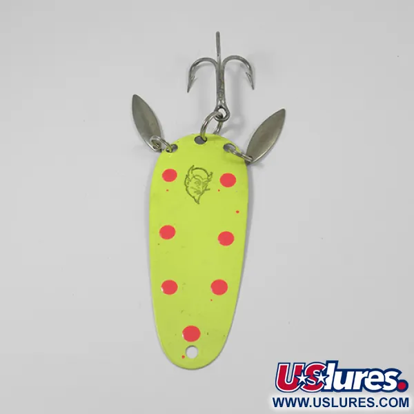 Levendige chartreuse-gele verf met opvallende rode stippen bedekt de voorkant van deze 8,5 cm Eppinger lepel. Gecatalogiseerd onder productcode 2016, verkeert dit exemplaar in uitzonderlijk schone staat (5/5), met behoud van de glanzende afwerking en scherpe stempels. Dit Dardevle Sagamore JT Buel model is voorzien van een gespecialiseerde hardware-configuratie aan de achterzijde, waar twee kleine zilveren spinnerbladen naast de dreg zijn gemonteerd, wat aanzienlijke metalen schittering toevoegt aan het gewicht van 12 g. Op de achterkant is de vernikkeling duidelijk gemarkeerd met de naam Sagamore JT Buel en "Detroit, U.S.A.", verwijzend naar de historische afkomst en de productiewortels in Michigan. Het iconische duivelskop-logo staat centraal op de geverfde zijde en identificeert het als een authentiek stuk uit de jarenlange Eppinger-catalogus.