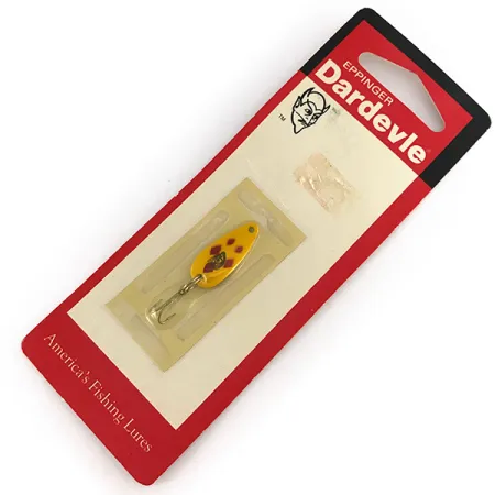 Gele lak geaccentueerd door levendige rode ruiten kenmerkt de iconische 'Five of Diamonds' afwerking op deze kleine 2 g (1/16 oz) lepel. Geïdentificeerd door productcode 7581, meet deze Eppinger Dardevle Skeeter een compacte 2,3 cm (1"), specifiek ontworpen voor licht materiaal werpen of verticaal jiggen op baarsachtigen en forel. Het exemplaar wordt gepresenteerd in de originele winkelverpakking, die intact is en bevestigt dat het kunstaas ongebruikt is. Aan de achterzijde vormt het adres van Eppinger Mfg Co. in Dearborn, Michigan, een historisch anker, aangezien het bedrijf daarheen verhuisde in 1959 om hun traditie van Amerikaans vakmanschap voort te zetten. De verpakking bevat ook de vintage 'America's Fishing Lures' branding en het kenmerkende duivelskoplogo dat al meer dan een eeuw het handelsmerk is van de ontwerpen van Lou Eppinger. Een kleine, scherpe dreg is bevestigd via een stevige splitring, klaar voor gebruik of verzameling. Dit lichtgewicht kunstaas vertrouwt op zijn gespecialiseerde holle body om zijn kenmerkende actie in het water te creëren tijdens een langzame, gestage inhaalbeweging.
