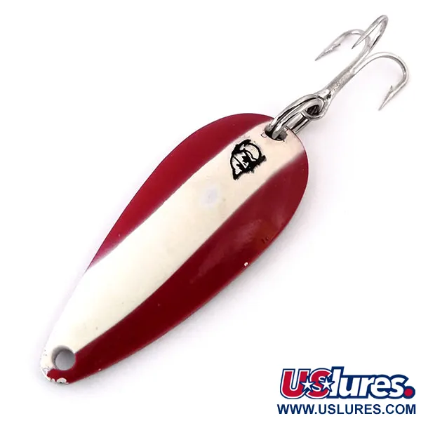 Gepolijst nikkel bedekt de achterkant van deze 9g (1/3 oz) lepel, voorzien van de iconische ingestanste merknaam en "U.S.A." herkomst. Met een lengte van 4,5 cm (1 3/4") toont de Dardevle Spinnie (artikelcode 10302) het klassieke rood-wit diagonaal gestreepte patroon dat een vaste waarde is in tackleboxen sinds Lou Eppinger begon met het handmatig maken van kunstaas in Detroit. De geverfde zijde is afgewerkt met een klein zwart duivelskop-logo bij het bevestigingspunt van de splitring. Dit specifieke exemplaar verkeert in 5/5 conditie, met het levendige pigment en de hoogglanzende plating die verwacht mag worden van een goed bewaard gebleven vintage Eppinger model. Ontworpen voor werpen of trollen; de concave vorm en het verzwaarde lichaam van de Spinnie zorgen voor de kenmerkende wiebelende actie waarmee het bedrijf sinds de oprichting in 1906 naam heeft gemaakt. De hardware is solide, met een zilverkleurige dreg bevestigd aan een splitring. Dit formaat is bijzonder effectief voor baars of forel en weerspiegelt de productienormen die nog steeds worden gehanteerd in de fabriek in Dearborn, Michigan.