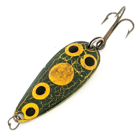 Een opvallende groene crackle-afwerking siert de voorzijde van deze 4,5 cm (1 3/4") lange lepel, uitgevoerd in het gezochte Frog-patroon. Het vakmanschap van Eppinger komt volledig tot uiting in deze Dardevle Spinnie, productcode 12270. Dit model heeft een uitgesproken concaaf ontwerp, kenmerkend voor het merk sinds Lou Eppinger in Detroit begon met het met de hand vervaardigen van kunstaas. De visuele aantrekkingskracht komt van grote gele cirkels met zwarte kernen, geplaatst tegen een web van gele lijnen op een donkergroene basis. De achterkant van het kunstaas onthult een strakke, zilverkleurige rug met het stempel "DARDEVLE SPINNE U.S.A.", wat de herkomst uit Dearborn, Michigan bevestigt. Met een gewicht van 9 g (1/3 oz) biedt hij een aanzienlijke massa voor een kunstaas van deze afmetingen. De montage bestaat uit een dreg en een splitring, beide met minimale gebruiksspuren. Dit exemplaar is prachtig bewaard gebleven, wat een conditiescore van 5/5 rechtvaardigt. De scherpte van de belettering op de achterzijde vormt een duidelijke link naar de fabricagematrijzen die uniek zijn voor de Eppinger-fabriek.