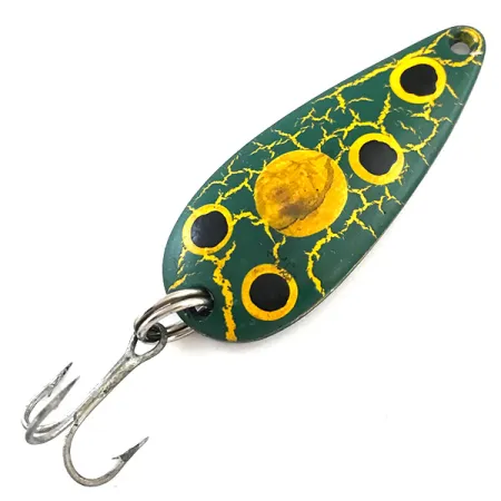 De stempel "DARDEVLE SPINNIE U.S.A." op de gepolijste zilveren onderzijde identificeert deze klassieke lepel als een waar stukje Amerikaanse hengelsportgeschiedenis. Hij is voorzien van het kenmerkende "Frog" patroon, bestaande uit een diepe bosgroene basis met gele aders en vijf opvallende zwarte stippen met gele halo's. Met een lengte van 4,5 cm (1 3/4") en een gewicht van 9 g (1/3 oz) is dit kunstaas een veelzijdige maat voor diverse zoetwatersoorten. Een stevige splitring verbindt het holle metalen lichaam met een vintage dreg, wat de robuuste kwaliteit benadrukt die het bedrijf van Lou Eppinger al sinds het begin in Detroit in 1906 hanteert. Dit specifieke exemplaar heeft productcode 5246 en verkeert in 5/5 staat, met een glanzende, goed bewaarde afwerking en schoon beslag. De gepatenteerde gestanste vorm is ontworpen om licht te vangen tijdens het binnenvissen of wanneer hij door de waterkolom zinkt.