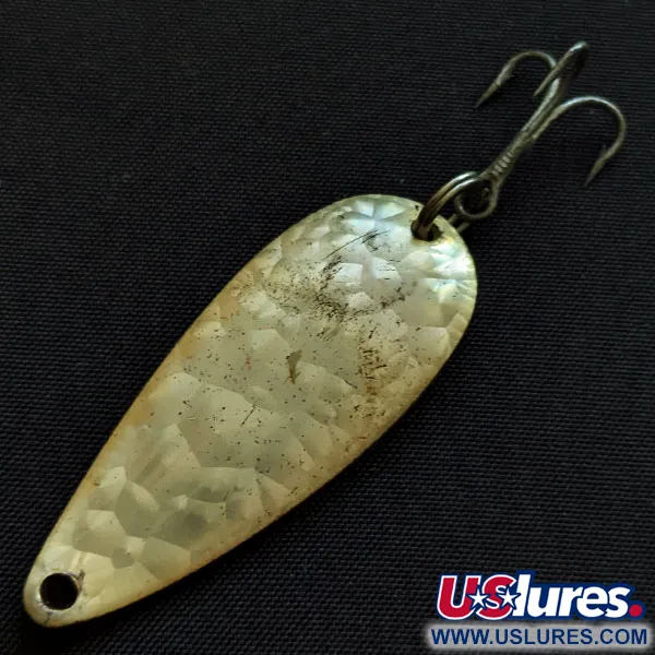 Gehamerde metalen facetten vangen het licht op de unieke Crystal-afwerking van deze klassieke Amerikaanse lepel. Duidelijk gestempeld op de achterzijde met het merkteken van de maker en "SPINNIE U.S.A.", vertegenwoordigt deze Eppinger Dardevle, productcode 18714, de erfenis die Lou Eppinger in 1906 begon. Dit exemplaar meet 4,5 cm (1 3/4") en weegt 9 g (1/3 oz), waardoor het een solide keuze is voor diverse zoetwaterrovers tijdens het werpen. De conditie is een solide 4/5, met een schoon oppervlak en een stevige dreg die klaar is voor gebruik. Eppinger gebruikt eigen matrijzen om de specifieke langwerpige vorm en het holle profiel te bereiken, die centraal staan voor de waggelende actie die het kunstaas creëert tijdens een gelijkmatige inhaalbeweging. Voor heldere wateromstandigheden zijn de lichtreflecterende eigenschappen van deze specifieke metallic afwerking al generaties lang een vaste waarde voor sportvissers.