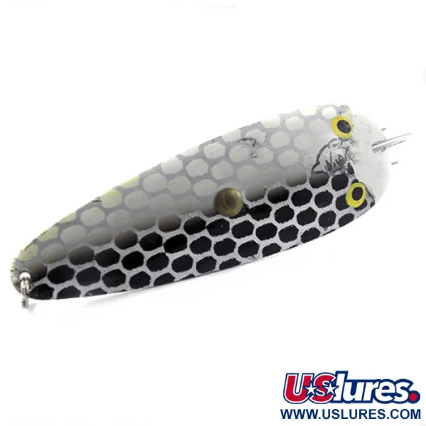 Met een gewicht van 40 g (1 1/3 oz) is deze Eppinger Dardevle Trolldevle een robuuste keuze om de gewenste diepte te bereiken bij het werpen of trollen. De lepel heeft een contrastrijk zwart-wit honingraatpatroon, aangevuld met twee heldergele ogen. Met een lengte van 11,5 cm (4 1/2") is dit model 1178 gebouwd voor efficiëntie in zware begroeiing, voorzien van een wierbeschermer over de sterke enkele haak. De achterzijde in gepolijst nikkel draagt de stempel "Dearborn, MI", een verwijzing naar de geschiedenis van het bedrijf na de verhuizing van de oorspronkelijke locatie in Detroit in 1959. Met een conditie van 4/5 vertoont dit exemplaar lichte gebruikssporen terwijl het een heldere, schone uitstraling behoudt. De specifieke langwerpige kromming is ontworpen voor een consistente waggelende actie, volgens dezelfde Amerikaanse productienormen die Lou Eppinger in 1906 vaststelde.