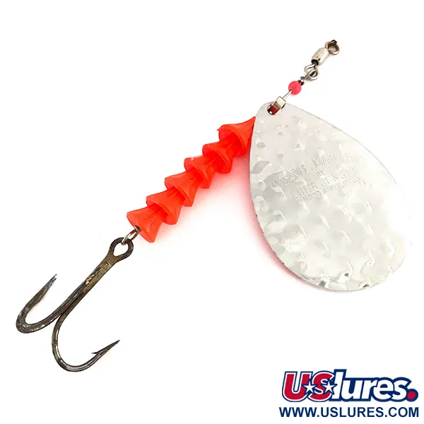 Gehamerde nikkeltexturen op het druppelvormige blad zorgen voor een klassiek reflecterend oppervlak dat kenmerkend is voor dit Luhr Jensen model. Met een lengte van 13 cm (5") en een gewicht van 17 g (3/5 oz) bevat deze Dave Davis UV sleeppunner, bekend onder productcode 7673, een reeks van vijf kegelvormige plastic kralen in een fluorescerende oranje-roze tint. Deze kralen zijn ontworpen om te reageren op ultraviolet licht, waardoor het systeem zichtbaar blijft in diepere waterlagen of bij bewolkt weer. De achterkant van het blad is afgewerkt in effen mat oranje, wat een duidelijk contrast vormt met de glanzende metalen voorkant. Aan de achterzijde is een donker afgewerkte dreg bevestigd via een draadoog, terwijl de voorzijde is voorzien van een tonwartel om rotatie tijdens het trollen te vergemakkelijken. Met een conditiescore van 4/5 vertoont het kunstaas goed geconserveerd schilderwerk en glanzend metaal uit de Amerikaanse fabricageperiode.