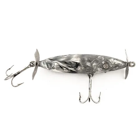 Gemarmerde grijs- en zwarttinten kenmerken de afwerking van deze Amerikaanse klassieker uit het midden van de vorige eeuw. De Diamond Rattler Jim Strader, die in de jaren vijftig in de VS ontstond, is een zeldzame vondst voor verzamelaars van oppervlakkunstaas. Met een gewicht van 8g (1/4 oz) meet het slanke lichaam 7cm (2 3/4") en is voorzien van een opvallend marmerpatroon dat de gehele romp bedekt. Zowel de neus als de staart zijn uitgerust met metalen propellers, ontworpen om waterverplaatsing aan de oppervlakte te creëren tijdens een gelijkmatige inhaalbeweging. De montage bevat twee dregghaken — één centraal op de buik en één aan de achterzijde — die allemaal in goed bewaarde staat verkeren. Een subtiel ingezet oog voegt een vleugje realisme toe aan de kopsectie. Dit exemplaar, geïdentificeerd door productcode 11552, is in uitstekende staat met een beoordeling van 5/5.