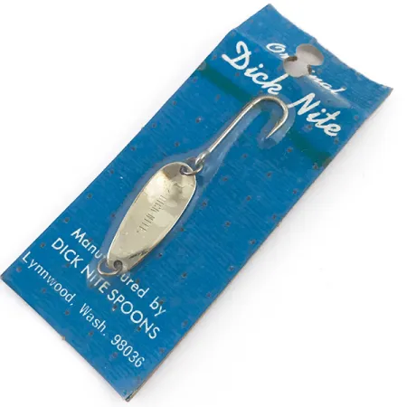 Met een lengte van precies 1" (2,5 cm) is het dunne metalen profiel van deze Dick Nite #1 afgewerkt in een helder, klassiek nikkel. Geproduceerd in de VS door Dick Nite Spoons onder productcode 4939, weerspiegelt dit exemplaar de traditionele productiestijl uit Lynnwood, Washington. Met een vedergewicht van 1/32 oz (1 g) is de lepel bedoeld voor licht materiaal bij het werpen of trollen waarbij een klein profiel nodig is. Hij verkeert in ongebruikte staat, nog steeds bevestigd aan de originele blauwe kartonnen verpakking met de "Original Dick Nite" branding. Het oppervlak van de lepel is schoon en reflecterend, voorzien van een enkele haak bevestigd aan het achterste oogje.