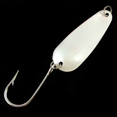 Met een gewicht van 1,7 g (1/16 oz) is deze klassieke dunne metalen lepel een vast onderdeel van de vistraditie in het noordwesten van de Grote Oceaan. Het lichaam van 3,5 cm (1 1/2") is afgewerkt met een White Pearl oppervlak aan de ene kant en een Fluorescent Red UV Glow aan de andere kant, een combinatie die speciaal is ontworpen voor situaties met hoge zichtbaarheid en presentaties in diep water. Geregistreerd onder productcode 4874, werd dit exemplaar in de VS vervaardigd door Dick Nite Spoons, een merk dat bekend staat om zijn gespecialiseerde materiaal voor trollen en driftvissen. Het kunstaas is uitgerust met een scherpe, enkele haak die via een splitring is bevestigd, samen met een klein bevestigingsoog bij de neus om de karakteristieke dwarrelende actie te bevorderen. Dit item verkeert in een staat van 5/5 en behoudt de schone afwerking en integriteit van de originele UV-reactieve coating.