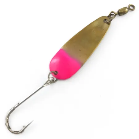 Het gewicht van 1,7 g (1/16 oz) geeft deze Dick Nite #2 het ideale profiel voor subtiele presentaties in helder water. Met een lengte van 3,5 cm (1 1/2") heeft de lepel een tweekleurige Goud / Rood afwerking, waarbij het rode gedeelte een levendige, fluorescerende kwaliteit heeft die afsteekt tegen de metalen basis. De merknaam is duidelijk in het goudkleurige metaal gestempeld, wat de herkomst van de Dick Nite Spoons firma in de USA aangeeft. Dit specifieke exemplaar, herkenbaar aan productcode 5314, is uitgerust met de originele kleine messing tonwartel en een enkele haak met lange steel. Met een conditiescore van 4/5 vertoont het kunstaas een schoon oppervlak en goed onderhouden hardware. De dunne metaaldikte die bij de constructie is gebruikt, weerspiegelt de traditionele productietechnieken voor dit kunstaas, dat specifiek is ontworpen voor effectief gebruik bij het slepend vissen op lage snelheden.