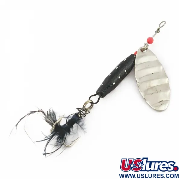 Deze in Japan gemaakte spinner weegt 1/4oz (7g) en heeft een opvallend taps toelopend zwart lichaam met een witte marmertekening. Het nikkelen blad heeft een geribbelde textuur die is ontworpen om licht te vangen over de gehele lengte van 2 3/4" (7cm). De Dolphin Marble Spinner, herkenbaar aan productcode 24421, is een voorbeeld van typisch Japanse fabricage uit het midden van de vorige eeuw, wat terug te zien is in de eenvoudige wire-wrap constructie en rode kraalaccenten bij het oogje. De dreg is voorzien van donkere veren, wat een zacht visueel profiel geeft achter het verzwaarde, gemarmerde lichaam. Dit exemplaar toont zijn ouderdom door een bewogen geschiedenis aan de waterkant, wat tot uiting komt in een conditiescore van 1/5 met duidelijke gebruikssporen van eerdere vistrips. Dankzij een kleine metalen beugel draait het ovale blad iets van het zwart-witte lichaam af, waardoor het klassieke silhouet van een inline spinner behouden blijft.