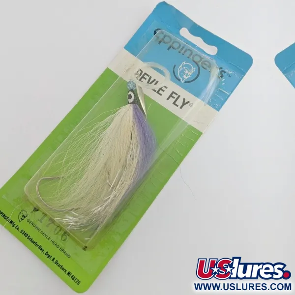 Paars en wit bucktail-haar vormt het primaire visuele profiel van deze gespecialiseerde trollingmontage, een ontwerp dat het midden houdt tussen een traditionele lepel en een vlieg. Geproduceerd door Lou J. Eppinger Mfg. Co. uit Dearborn, Michigan, maakt de Devle Fly gebruik van een vrij draaiend metalen blad op een as om schittering te genereren tijdens het slepen. Dit exemplaar, met productcode 24438, is voorzien van een vernikkeld blad gecombineerd met een wit-paars gedecoreerde haak. Het is ontworpen voor diepwatertrolling en wordt vaak gebruikt in combinatie met een flasher of attractor bij het vissen op meerforel en andere zalmachtigen. De lure bevindt zich in de originele groen-blauwe kaartverpakking en is ongebruikt (conditie 6). De montage bevat een enkele haak die in het bucktail is geïntegreerd voor een gestroomlijnd profiel. Een geschilderd oogdetail op het loden gedeelte van de vlieg biedt een specifiek richtpunt achter het roterende nikkelen blad.