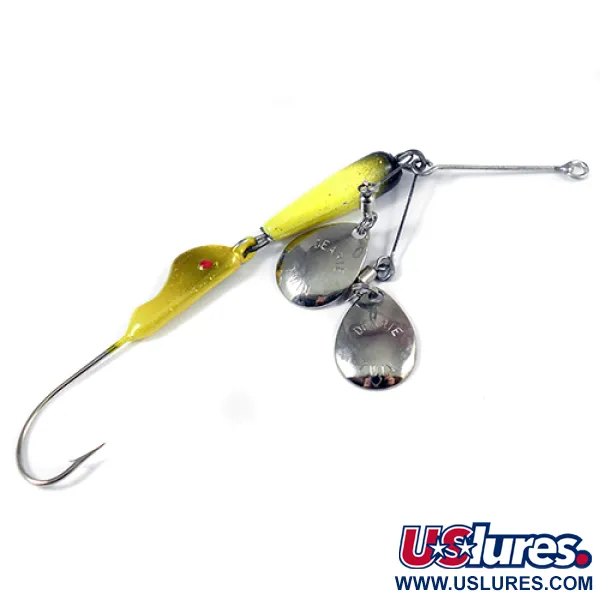 Op de nikkelen bladen staat duidelijk het merk 'DEARIE TWIN' gestanst, wat dit identificeert als een gespecialiseerde variant van de legendarische weight-forward spinner. Een felgele loden kop, geaccentueerd met een donkerolijfkleurige spray bij de neus, zorgt voor het gewicht van 1/2 oz (14 g) dat nodig is voor het driften en werpen in diep water. Dit specifieke model, productcode 2005, maakt gebruik van een metalen frame om twee gepolijste nikkelen bladen te herbergen in plaats van de traditionele enkele, waardoor het visuele profiel wordt vergroot. De verf blijft levendig en de nikkelen onderdelen zijn reflecterend, wat leidt tot een conditiescore van 5/5. Ontworpen voor de zware omstandigheden van de visserij op glasoogbaars in de Grote Meren, is het kunstaas voorzien van een robuuste enkele haak die direct achter het verzwaarde lichaam is geïntegreerd. De gestanste belettering op beide bladen is scherp en leesbaar, wat de kwaliteitscontrole van de Amerikaanse productie weerspiegelt.