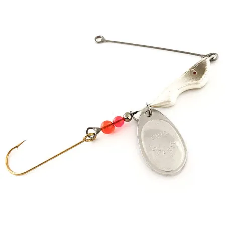 Het heldere nikkel-afgewerkte blad van deze spinnerbait, duidelijk voorzien van de merknaam, dient als de primaire visuele attractor. Met een gewicht van 1/2 oz (14 g) is deze Erie Dearie Walleye Killer, geïdentificeerd door productcode 12120, een klassiek voorbeeld van Amerikaans geproduceerd materiaal, specifiek ontworpen voor de "weight-forward" technieken die populair zijn op de Grote Meren. De constructie heeft een wit en zilveren visvormige kop gevolgd door een reeks van drie kralen – twee in levendige oranje en rode tinten en één kleine metalen spacer. Een enkele, scherpe goud-afgewerkte haak is bevestigd aan het uiteinde, klaar om te worden opgetuigd met een dauwworm, zoals traditioneel is voor dit type kunstaas. De metalen arm is recht en goed onderhouden, eindigend in een schoon oogje voor directe lijnbevestiging. Dit exemplaar verkeert in 5/5 conditie, met schone oppervlakken en geen tekenen van gebruik op het beslag of de nikkelafwerking.
