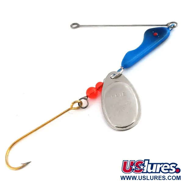 Deze spinnerbait van 12g heeft een kenmerkende verzwaring in diepblauw met een enkele rode oogstip. Het vernikkelde blad is duidelijk voorzien van de naam ERIE, een kenmerk van de Erie Dearie-traditie in de VS. Twee felrode kralen zijn op het metalen frame geplaatst en leiden naar een scherpe, vergulde langstelige haak. Dit model, met productcode 9929, heeft een conditiescore van 5/5 en vertoont geen sporen van gebruik of opslag op de blauwe lak of metalen oppervlakken. Oorspronkelijk ontwikkeld voor het driften over rotspartijen en riffen, ligt de focus van het ontwerp op duurzaamheid en een hoge zichtbaarheid in verschillende wateromstandigheden.